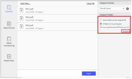 Click on Batch process and a Window will open. Note the different batch options that are available on the left pane, namely: convert, Data extract, Bates numbering and watermark. Here we will be using the convert option to convert multiple PDF files to a different file format.