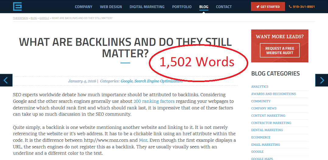 The first search I did was for the keyword “what are backlinks?” The first result was from the website, TheeDesign. It was a blog post with a word count of 1,502.